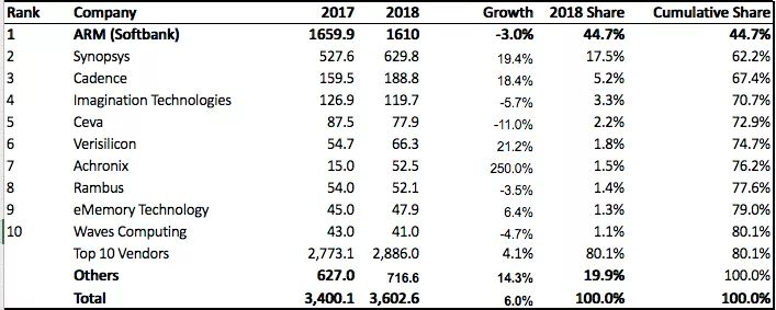 据IP Nest的统计数据显示,整个IP市场2018年的总值为36.02亿美元,当中虽然Arm的份额连续第三年下滑,但是他们的占有率还是高达44.7%,遥遥领先于第二位。IP Nest在报告中还谈到,高端产品的授权转向了架构授权,而最低端的处理器则开始拥抱RISC-V。在2018年的IP市场里,还有一个值得关注的点,那就是机器学习和其他专用架构产品的兴起。