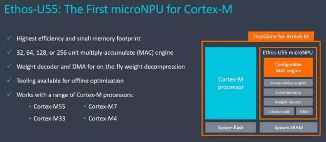 Arm的官方表示,新增的Cortex-M55是Arm历来AI能力最为强大的Cortex-M处理器,也是首款基于Armv8.1-M架构、内建Arm Helium向量处理技术的处理器,它可以大幅提升DSP与ML的性能,同时更省电。Arm同时指出,在这个新的处理器上,客户可以使用Arm Custom Instructions (Arm自定义指令集)延伸处理器的能力,对特定工作负载进行优化。来到Ethos-U55,这是一个可从32个MAC扩展到256个MAC的micro NPU,在与Cortex-M55耦合之后,能够为微控制器带来480倍的机器学习性能飞跃。
