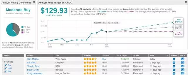 总体而言,QRVO股票评级为分析师一致认为的温和买入。这是基于最近的17次评论得出的结论,其中买入和持有各占10-7。该股定价为104.19美元,平均目标价129.93美元意味着上涨24%。