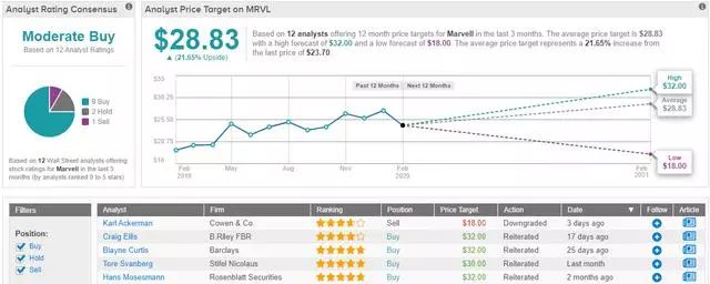 Marvell的温和买进评级是基于近期9只买进,以及2只持有和1只卖出。对芯片行业来说,这是一只便宜的股票,价格只有23.69美元。该股的平均目标价为28.83美元,意味着上涨潜力为22%。伴随着适度的股息,这给了股票一个高回报的潜力。