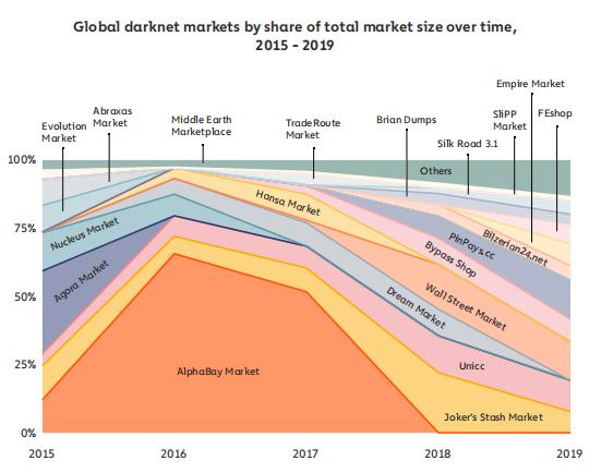 毒品市场在这里也占据主导地位。然而,专门从事其他非法商品的市场也带来了可观的资金。Joker 's Stash Market 和 UNICC 是在整个时间段内保持稳定人气的两个最典型的市场。