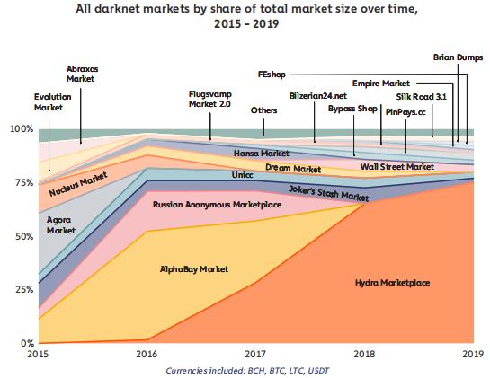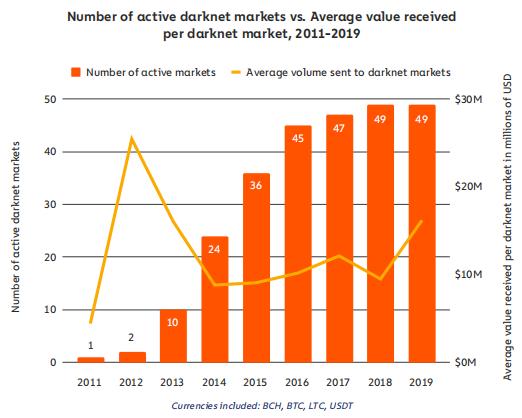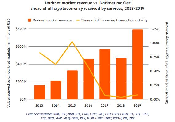 数据显示,经过 2018 年的小幅下滑,2019 年暗网市场总销售额增长了 70%,其销售额首次超过 6 亿美元。不仅如此,自 2015 年以来,暗网市场交易在所有加密货币交易中所占的份额增加了一倍,从 0.04% 增至 2019 年的 0.08% 。