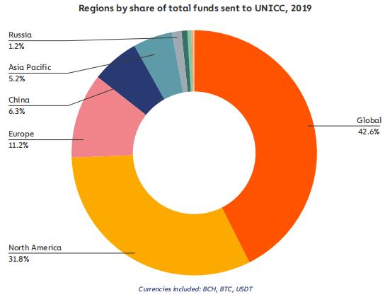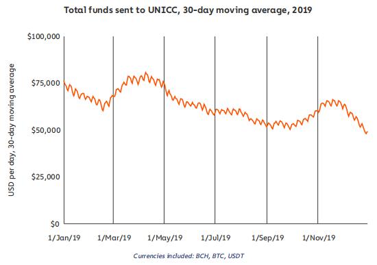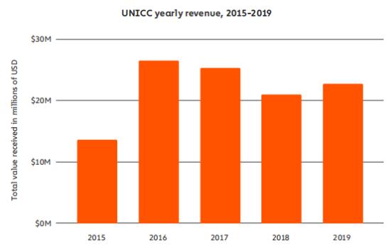 UNICC 在 2019 年接收了价值至少 2270 万美元的加密货币,使其成为去年第四大最活跃的市场。全年活动相对稳定,在 4 月份达到顶峰。根据总销售额和每张卡的平均成本估计为 10 美元,估计 UNICC 出售了近 300 万客户的卡数据。