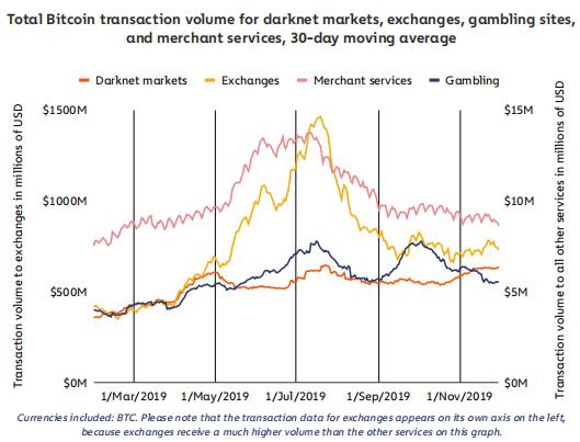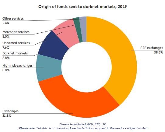 与之前类似,绝大多数暗网交易经由交易所进行。到目前为止,交易所是客户向供应商发送加密货币最常见的服务。