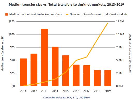 上述数据也证实,收入增长的驱动力是更多的购买,而不是更大的购买。以美元价值计算,购买规模中值保持相对稳定,但(跨黑市间)转账数量却再次大幅增加,从 900 万笔增至 1200 万笔。这表明,要么是 2019 年有更多客户从暗网市场购买,要么是老客户的购买量增加了。