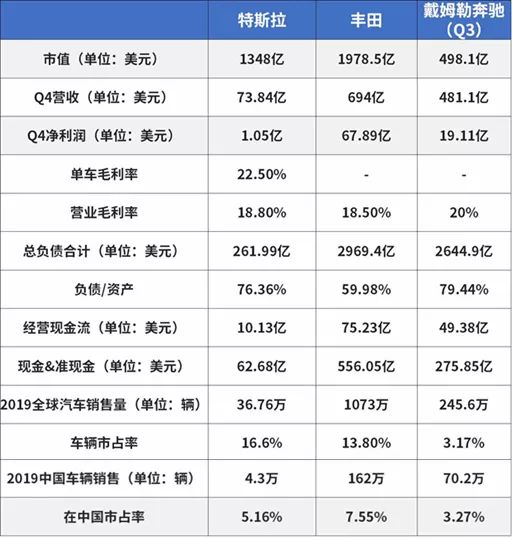 2019Q3戴姆勒奔驰的营收达到481.1亿美元,营业毛利率达到20%,另外的财务指标也差不多是特斯拉的4-5倍。可是,市场最终给出的戴姆勒奔驰市值仅为500亿美元,大概是特斯拉的三分之一多一些。