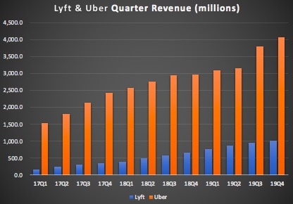 2019年Q4,Uber营收40.69亿美元,同比增长37%。Lyft最新财报显示,2019年Q4Lyft营收10.171亿美元,较上年同期为56.695亿美元,增长52%。