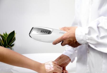 红外血管成像仪可以利用血管中血红蛋白对近红外光的吸收率与其他组织不同的原理,通过对数字影像的一系列处理,将皮下血管原位投影显示在皮肤表面,使医护人员能够清晰识别患者皮下6mm以内的细微血管,有效解决在静脉注射过程中血管评估不准确、穿刺点选择不当,继而造成药物外渗或血管损伤等输液并发症的问题。