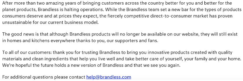 关于倒闭原因,这份声明解释道,“虽然Brandless团队为消费者重构了消费产品类型和预期价格的标准,但是DTC(直接面对消费者)领域残酷激烈的市场竞争验证,我们目前的商业模式是不可持续的。”一纸声明,道不尽的唏嘘。
