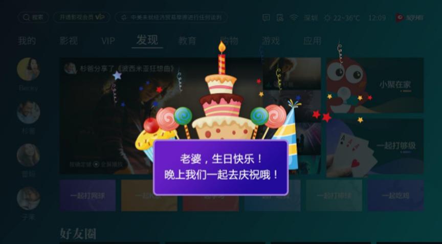 升级版的社交电视还首创了可以霸屏分享的家庭留言版功能。用户可以通过文字、图片、语音、视频四种形式进行在电视留言板上留言,当AI检测到家人生日、节日等关键词时,社交电视则会展示非常酷的霸屏祝福动效,营造出惊喜而浪漫的氛围。