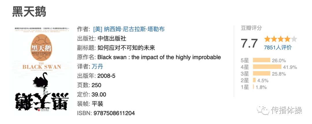 很多年前很火的一本书,当时还是08年全球金融危机的背景下,我自己看完这本书以后,陆陆续续把作者写的其他几本书都翻了一遍。作者是搞金融的,所以书里面引用的大多是金融方面的例子,《黑天鹅》讲的其实就是如何去认识不确定性,如何去应对不确定性。另外,塔勒布的书在语言上很通俗易懂,所以你可以看得很快。