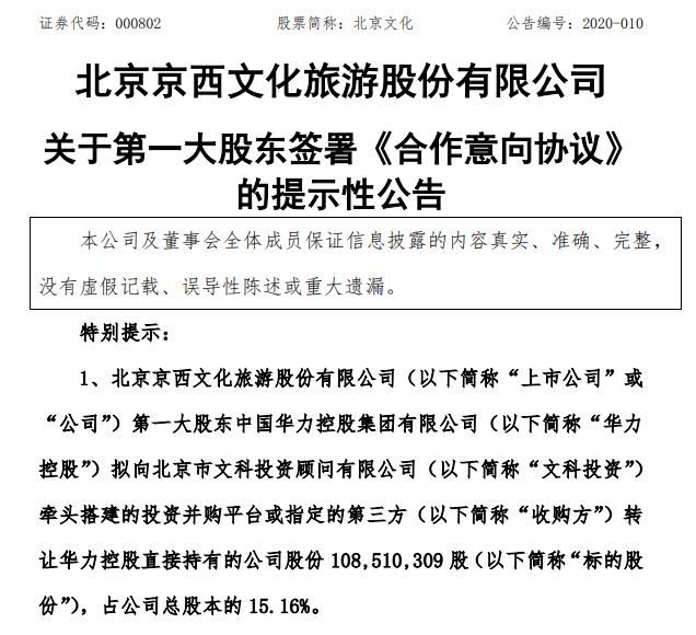 2月11日晚间,北京文化公告称,公司第一大股东华力控股拟将其所持公司15.16%股权进行转让。