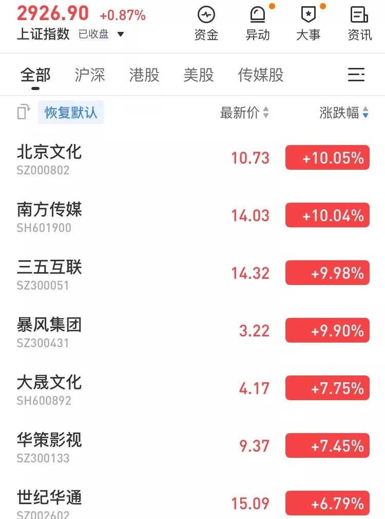 值得一提的是,近期被肺炎疫情笼罩的影视股目前出现了反弹,影视板块连续5日累计涨幅近10%。从今日收盘情况来看,北京文化涨停,华策影视、芒果超媒涨幅超过5%,奥飞娱乐、文投控股、慈文传媒等6只影视股涨幅超过2%,万达电影、光线传媒、幸福蓝海等10余只影视股实现微涨。