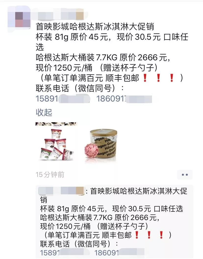 毒眸获悉,目前已经有多家影城,通过自媒体和朋友圈发布消息,依靠低价出售储备卖品爆米花、可乐和哈根达斯冰淇淋等维持生计。例如部分地区的首映影城就对外表示,原价2666元的大桶装哈格达斯,现价只要1250元,不仅赠送杯、勺,还支持顺丰包邮。