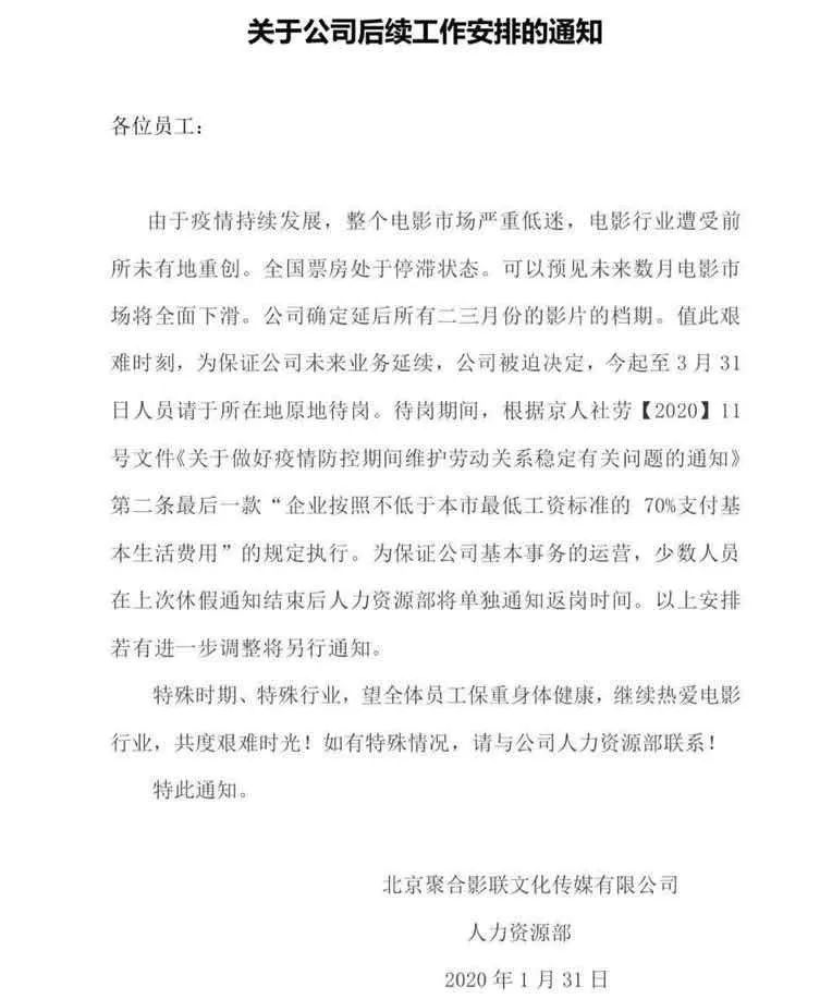 至于没有“存货”可卖的公司,则只能采取“壮士断腕”。1月31日,曾发行过《战狼2》《流浪地球》《我不是药神》等热门项目的聚合影联发布内部通知,称从即日起至3月31日,所有人员原地待岗,待岗期间公司将按照“不低于本市最低工资标准的70%支付基本生活费”,而北京最低工资标准为2200元/月,换算下来月工资仅有1540元。