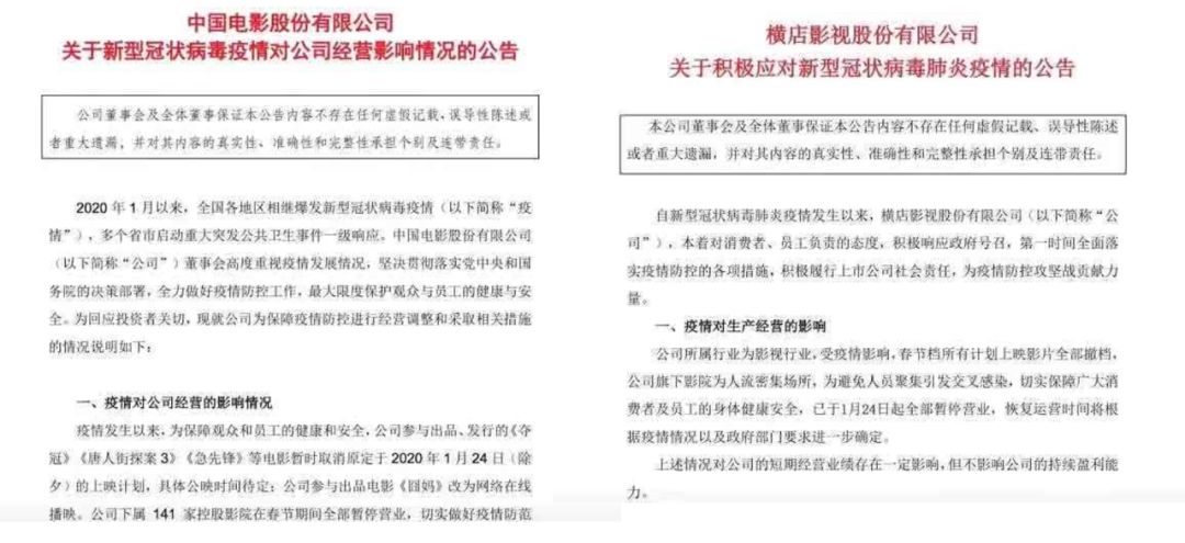 中国电影股份有限公司和横店影视股份有限公司发布旗下影院暂停营业公告