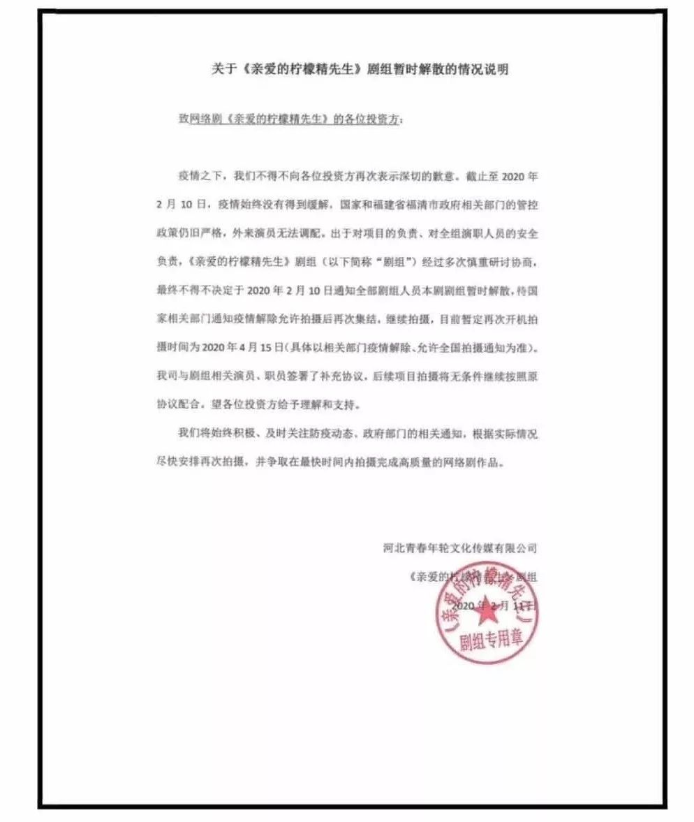 不过就在2月11日,网剧《亲爱的柠檬精先生》便成为了首个公开发表解散说明的剧组,此时距离该剧组发布停工公告,仅过去两个星期。