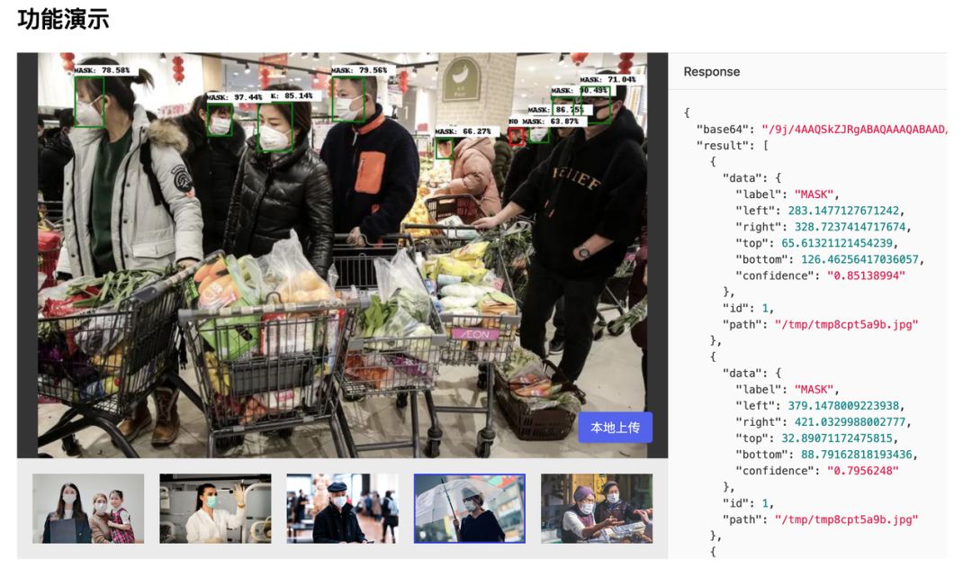 如上展示了最简单的本地推断,只要五行代码,我们就可以在自己的计算机处理口罩人脸检测。为了展示效果,我们设置了每张图像停留 2 秒。实际在我们采用 CPU 的情况下,检测基本是实时的,推断速度非常快。以下为调用预训练模型的核心代码,其中我们在当前文件夹下放了一张测试图像: