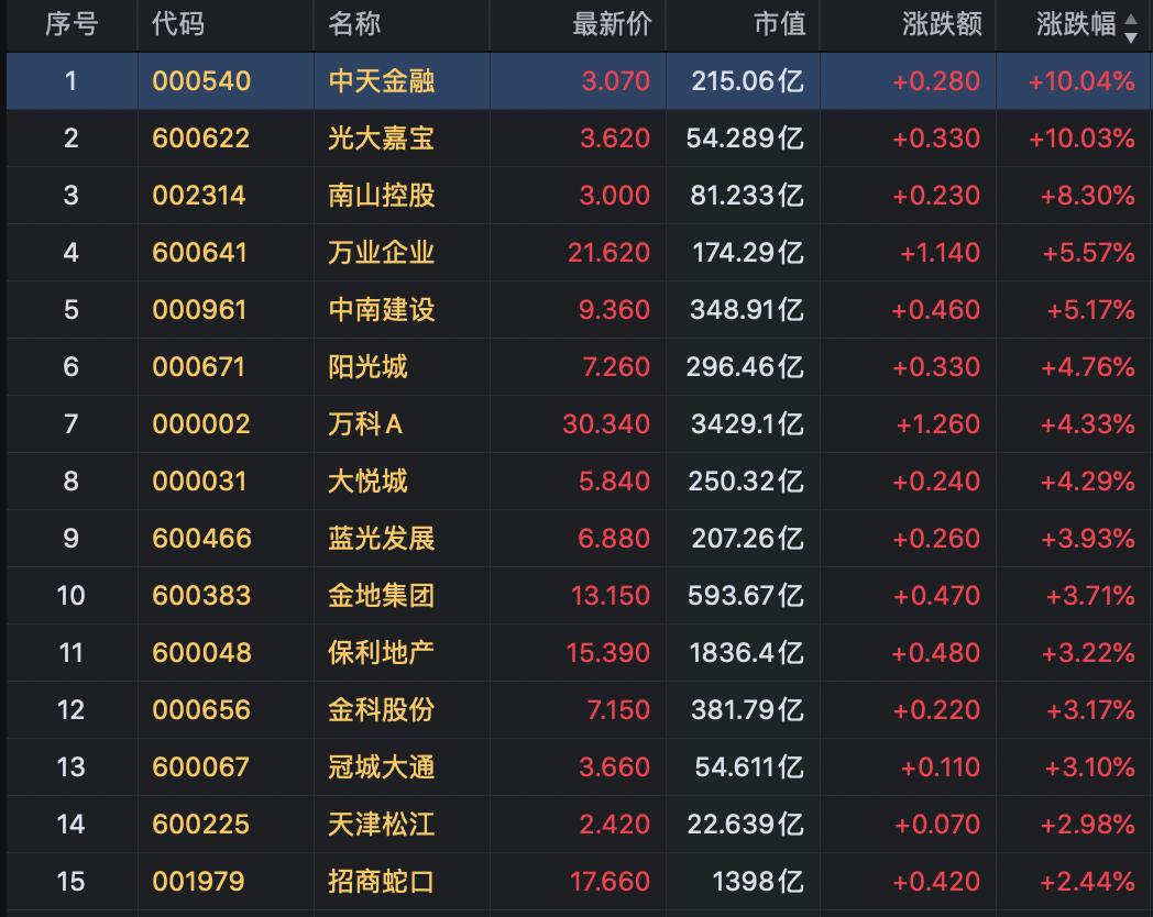 13日早间,地产股异动。截至发稿时,中天金融、光大嘉宝涨停。万科A、阳光城、大悦城涨幅超4%。保利地产、金科股份、金地集团、蓝光发展涨幅超3%。
