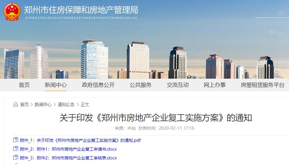 2月11日,郑州市住房保障和房地产管理局官网发布《关于印发〈郑州市房地产企业复工实施方案〉的通知》(以下简称《通知》)要求,郑州市房地产开发企业的行政办公部门(不含售楼处)提出申请并经审核通过后,可在2月24日后复工;房地产开发企业售楼部暂缓恢复开放,恢复开放时间另行通知。