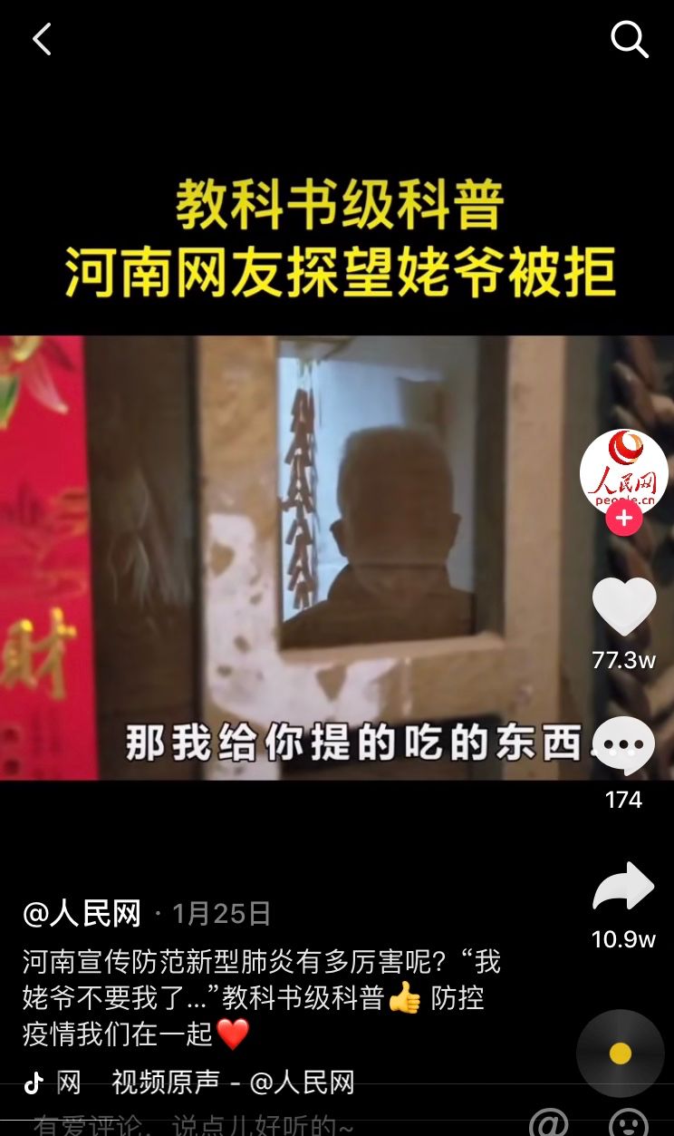 此外,1月25日左右,“姥爷不要我了”视频也持续发酵,春节看姥爷的外孙被拒之门外,而从窗户中扔下了口罩和红包。这一视频,以一位老人的防护自觉,被人们日报转发,称为“教课书级科普”。