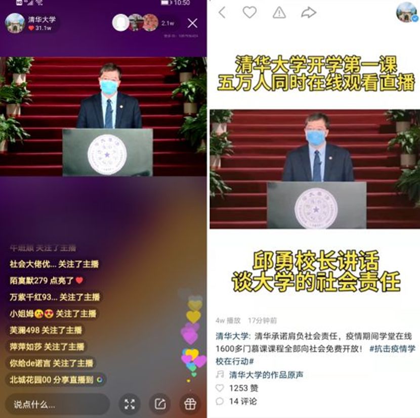 清华大学以在线直播的方式通过快手号与全校师生同上一堂特殊的“开学第一课”,课程持续了1小时50钟,吸引了超10万人的在线观看,累积获赞量达65.2W。