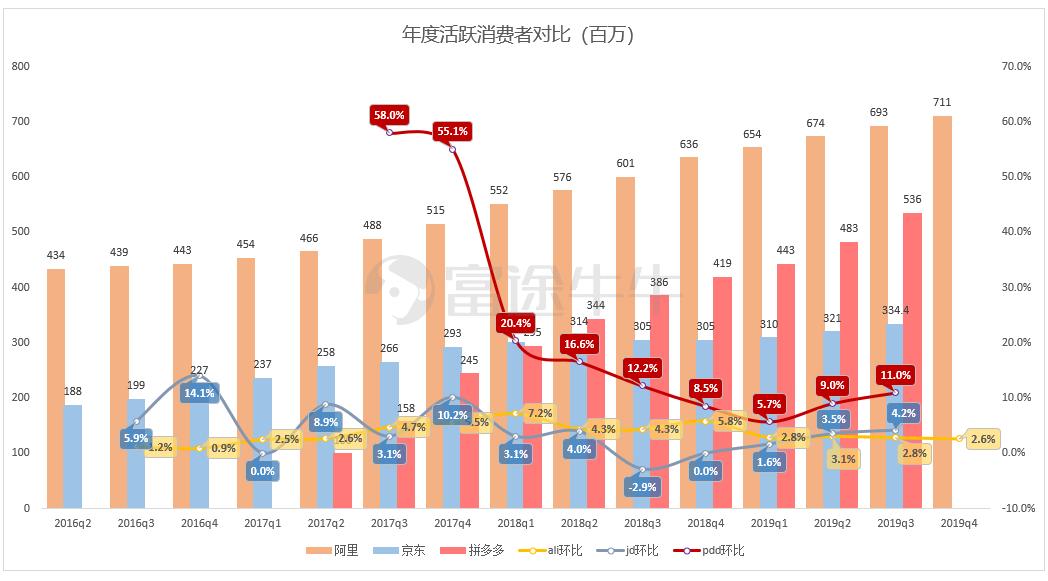 电商整体的渗透率在提升,阿里和拼多多向对方用户阵营的互相渗透也还在继续,于是从活跃消费者数据上看,三家电商目前都能维持上升趋势。阿里Q4年度活跃消费者环比增长1800万,这其中约有60%来自欠发达地区。
