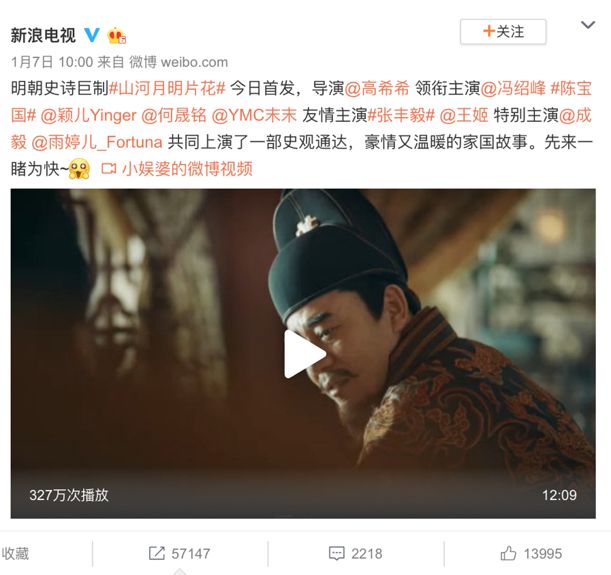 而就公开信息来看,则是欢瑞世纪库存压力稍小:2018年8月杀青、积压16个月的《山河月明》在1月初释出首发片花,制作精良的正剧画风、热度正高的明朝题材均增加了观众对该剧的期待,加上主演冯绍峰去年在热播剧《知否知否应是绿肥红瘦》中表现不俗,《山河月明》的首发片花在微博获得300多万播放量。