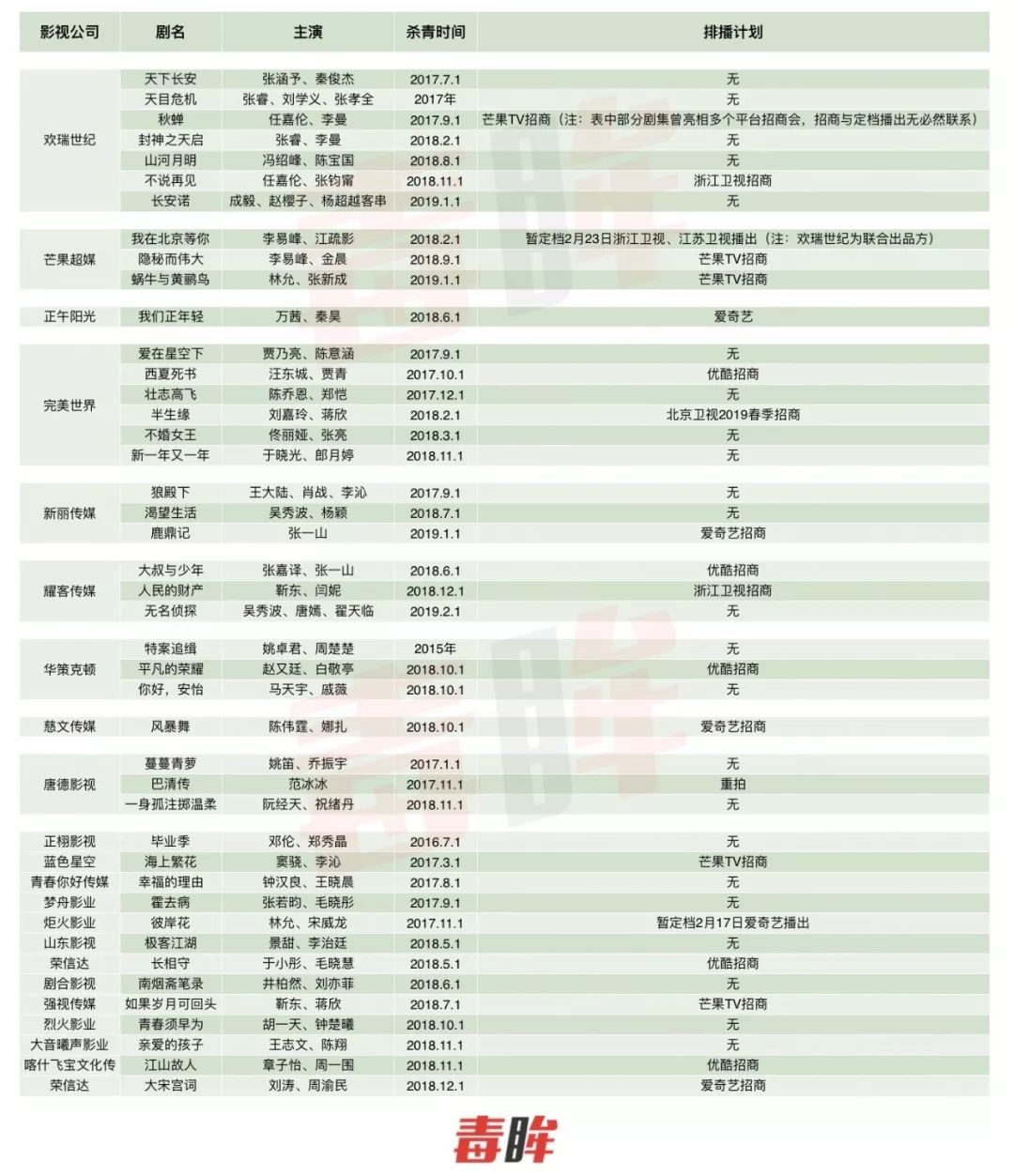 毒眸以“杀青超过一年未播出”为标准,统计了知名影视公司出品及知名演员出演的“积压剧”(注:仅以时间做参考,与制作水平无关),对它们的积压原因及解冻前景进行了逐一梳理。