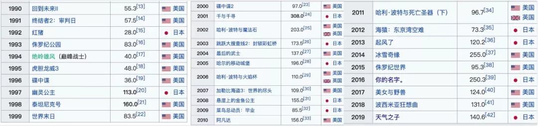 正是这样的跨服增长才让日本动画电影走向了世界,甚至一度成为顶点,成为日本电影中非常强的“战斗力”。日本在1990年以后的年度票房冠军,绝大部分时候是引进片,如果是本土电影拿下冠军,绝大分部时候都是动画电影。可以说动画电影是日本电影里最能打的那一个。