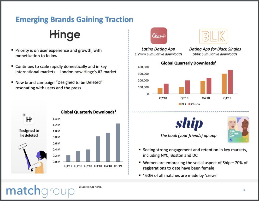 Match集团在财报中指出,据一项内部调查显示,人们平均使用四款约会应用。所以Match集团还推出了若干细分品牌,例如主打严肃婚恋的Hinge、定位拉丁裔用户的Chispa、定位非洲裔用户的BLK、号称好友替你选对象的Ship等等,力求覆盖更多用户和市场。