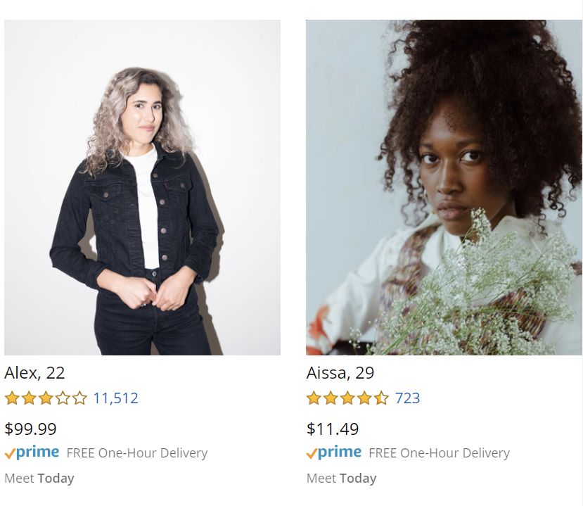 男女的照片被当成商品,陈列在网站上,标题则是每人的名字和年龄,每个约会对象都明码标价,4.99美元起售。与亚马逊的商品页面相差无几,还有星级评价。