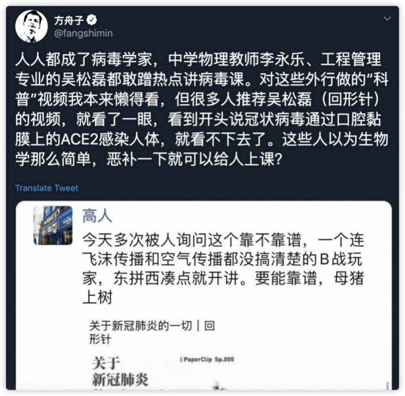 不过,前段时间有人讨论李子柒是不是“文化输出”一样,“回形针PaperClip”的视频也难以避免质疑之声。方舟子就在推特表示:“这些人以为生物学那么简单,恶补一下就可以给人上课?”