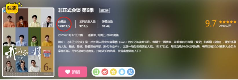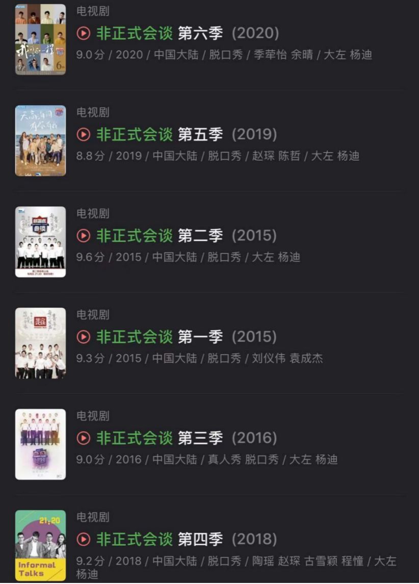 一个很好的例子是,湖北卫视一档名为《非正式会谈》的综艺,前四季豆瓣的平均分达到了近9.3 的水平。但这档节目一不如“XX大会”们严肃,二没有顶级流量参与,几乎每一季都处于“穷穿地心”的境地,到了第五季甚至因为招商失败而面临停摆。