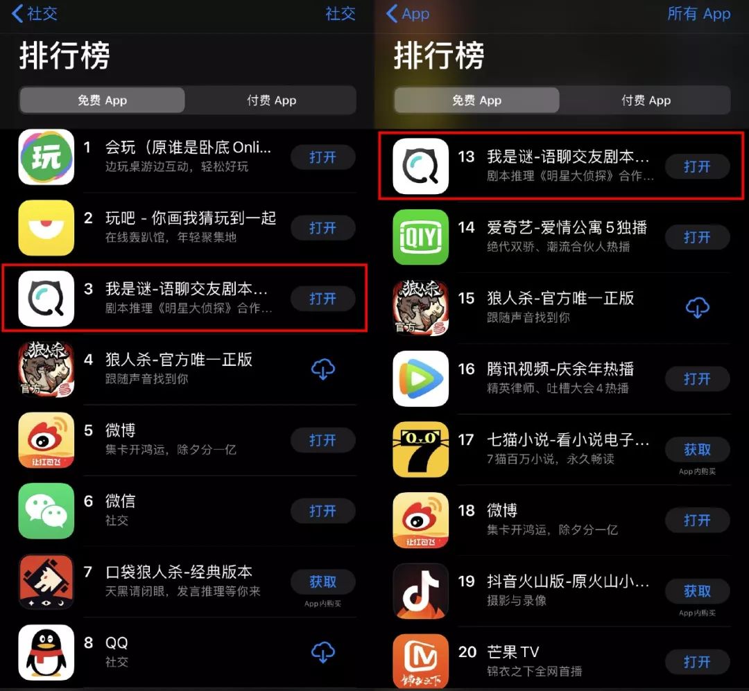 其中游戏品类表现亮眼,据QuestMobile数据,iOS免费榜排名上升最快的前1268个APP中游戏占了35%。免费社交应用榜单前列都被游戏类占据,在两个综合游戏APP后面,垂直游戏品类《我是谜》紧随其后排名第三,之后是两家狼人杀应用。