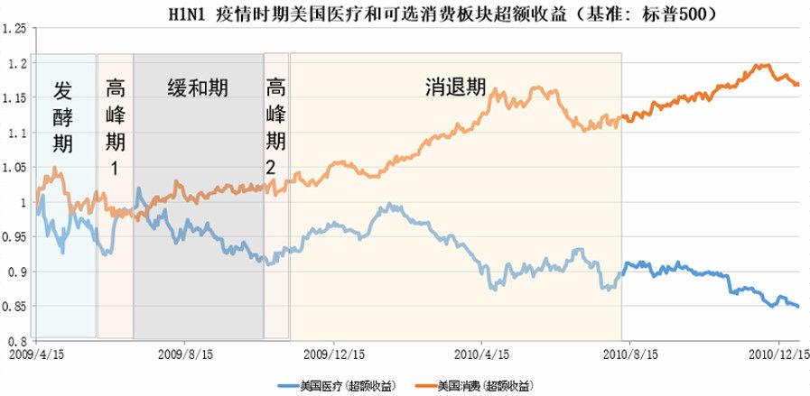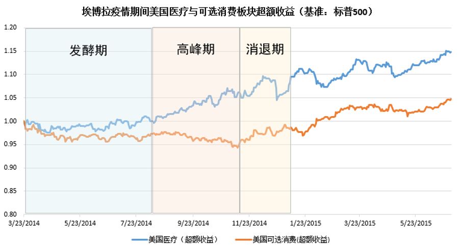 美国医疗板块和可选消费板块在埃博拉疫情期间的表现则大不相同。医疗板块在疫情进入高峰期开始便稳步跑赢大盘,其超额收益即便在疫情消退与结束后亦不曾衰减。相比之下,可选消费则在整个疫情期间内都跑输大盘,但在疫情消退后还是迎来了报复性上涨。