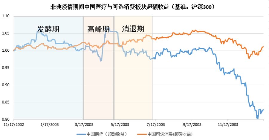 面对重大疫情带来的黑天鹅,还有不少人提出在股票资产内部通过板块轮动配置,亦可起到抵御疫情对市场的冲击的作用。在此我们也抛砖引玉,从板块超额收益的角度来探讨,在疫情中受益最大的医疗板块以及最受伤的可选消费板块在三次重大疫情中的表现是否如人们所想。