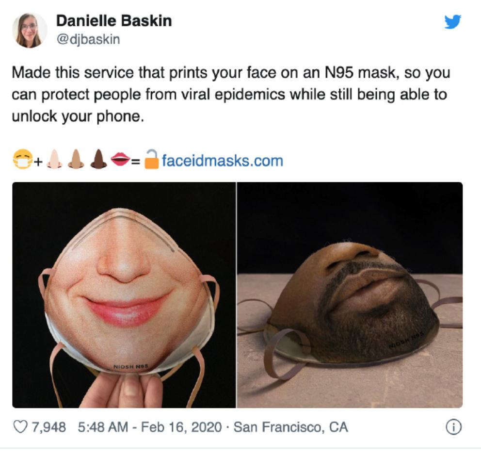 近日,外国网友Danielle Baskin发布了一款带有面部信息的口罩,让人们带着口罩也能用Face ID解锁手机。把被口罩遮住的面部信息打印在口罩上,戴上后就可拼凑成完整的脸部。定价40美元一个,但Baskin称口罩仍在研发。