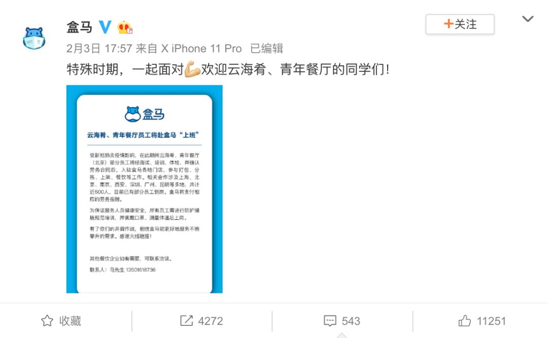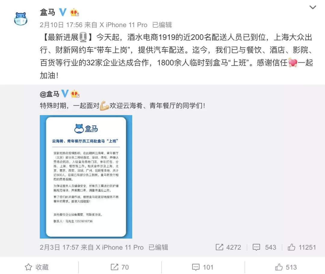 为解燃眉之急,盒马在2月3日推出“共享员工”计划,共享的第一批对象被划定为餐饮企业。这与餐饮企业目前存在大量待岗员工以及面临巨大人员开支有关。