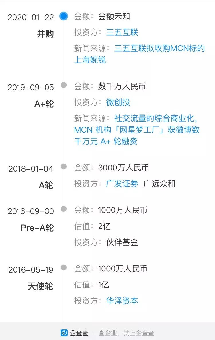 资料显示,上海婉锐成立于2012年,创始人夫子姜曾就职于盛大、新浪等科技公司,曾操盘2015年斯巴达攻占帝都事件营销。2015年,公司开始转向MCN业务,是国内最早形态的MCN之一,拥有知名行业品牌“网星梦工厂”,旗下知名网红包括韩41及大石桥联盟所有人,王萌萌and凡旭等。