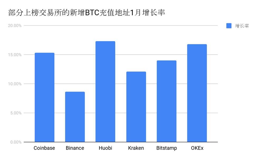 从新增 BTC 充值地址数来看,Coinbase 在 1 月份新增的 BTC 充值地址比位于第二三名的币安和火币加起来还多了 1271 个,是绝对的赢家。但是由于 Coinbase 充值地址可以更换,所以这个数字可能比真实值略高。