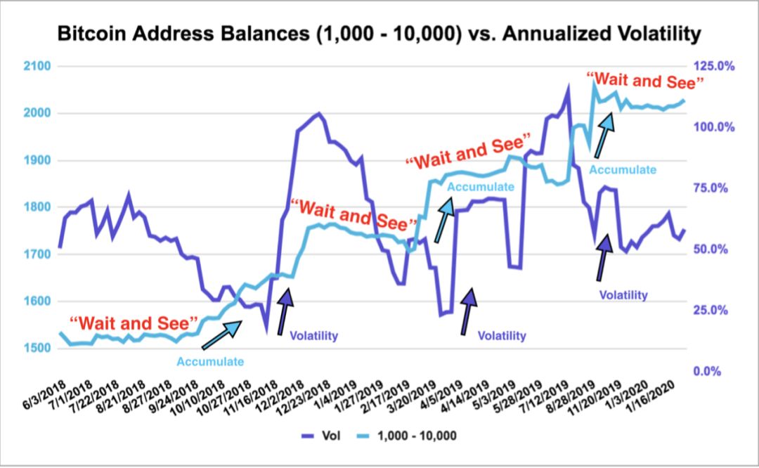 “鲸鱼”们这种“先囤币后波动”的行为会进一步吸收市场的流动性,导致市场出现供不应求的局面,从而在之后的几周或几个月内,将比特币的价格推向新高。