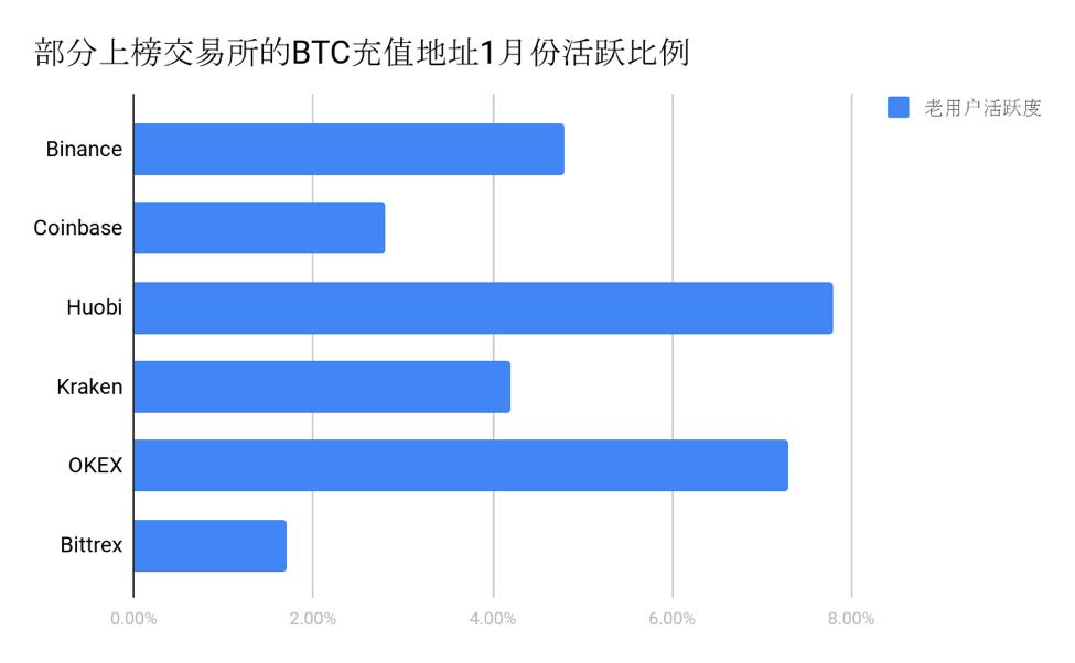 1 月的活跃充值地址(“活跃用户”)数据进一步印证了新增充值地址表现出的规律。这里的“活跃充值地址”是指在今年 1 月之前已经存在的交易所充值地址,可以看做“老用户”的活跃情况。