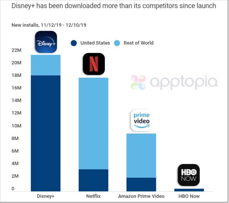 注:Disney+首发第一个月下载次数约2200万次(来源:Apptopia)