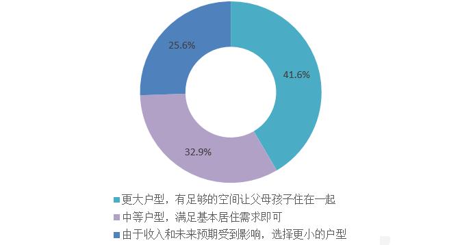 这次疫情下,全民隔离,不少人在家办公,明显感受到房间空间不够用。既要与家人在一起的生活空间,也要有自己独立的办公空间。家庭成员越多,对独立空间的需求也就越强。此次调查中,有41.6%的受访者表示疫情后更想购买大户型,以便和父母孩子一起居住。