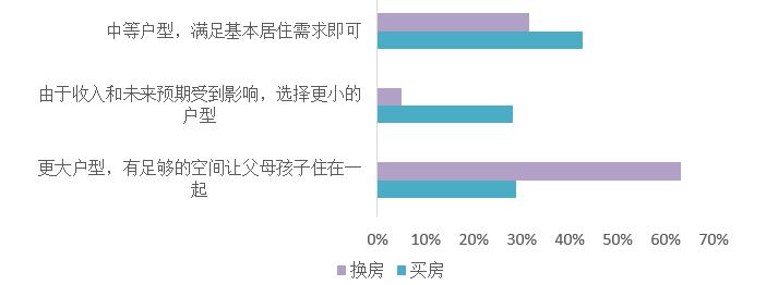 相较于买房者,换房者更愿意买大户型。在户型的选择上,买房者因资金实力相对较弱,更倾向于购买中等户型,而且因预期相对较差,选择小户型的比例也较高。而换房者更多选择大户型,占比高达63.3%。