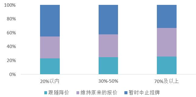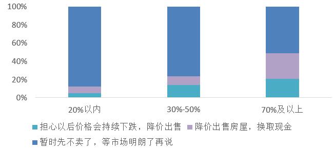 但还贷压力较大的业主降价出售意愿相对较强。在受访者中,少数业主月供收入比超出了合理范围,其预期较差,加上现金流需求更高,降价出售意愿相对较强。月供收入比在70%及以上的业主中,近一半的业主愿意降价出售。而且在面对开发商降价促销时,月供收入比越高的业主保持出售的意愿越强,且愿意跟随降价的比例越高。