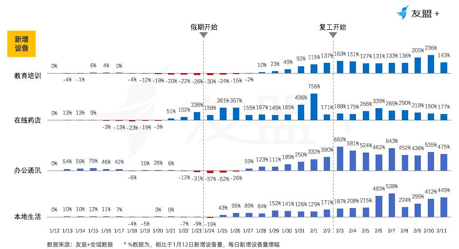 由于推迟复工与在家办公,远程沟通等需求,办公通讯类App在春节刚结束还未到复工阶段就已开始快速增长。 疫情助推了医疗健康类App发展,以在线药店为例,2月1日“双黄连”信息显著推高了在线药店的设备活跃度。 由于正值寒假,在线教育类App在刚迈入2020就展开了拉新大战,教育培训类App的设备活跃度持续攀升,而在2019年,春节后活跃设备为负增长。