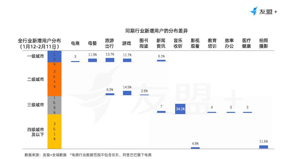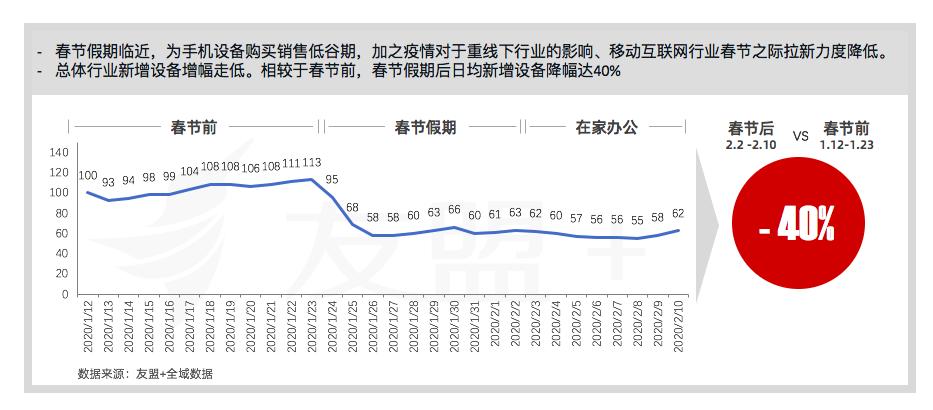 春节假期临近,为手机设备购买销售低谷期,加之疫情对于重线下行业的影响、移动互联网行业春节之际拉新力度降低。 总体行业新增设备增幅走低。相较于春节前,春节假期后日均新增设备降幅达40%。