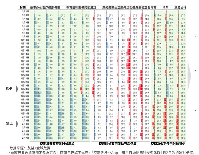 效率办公、医疗健康、母婴、培训教育及图书阅读类App疫期及春节整体使用时长趋于走高。关爱自我、家人与关注成长类的App保持了使用时长的持续增加。